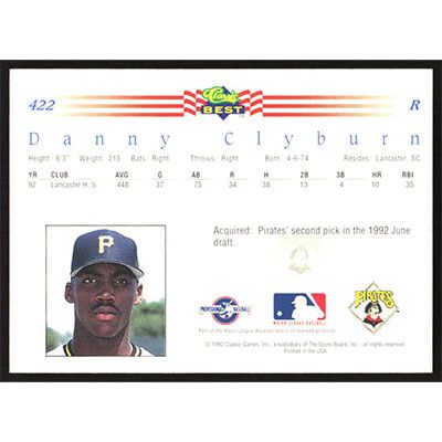 This is a 1992 Classic/Best Danny Clyburn baseball card. The card is #422 and pictures show condition.