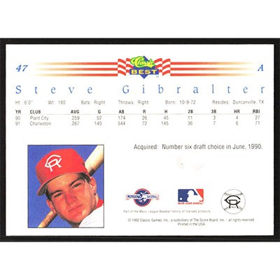 This is a 1992 Classic/Best Steve Gibralter baseball card. The card is #47 and pictures show condition.