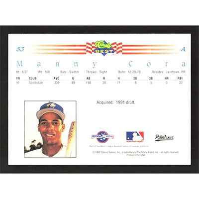 This is a 1992 Classic/Best Manny Cora baseball card. The card is #53 and pictures show condition.