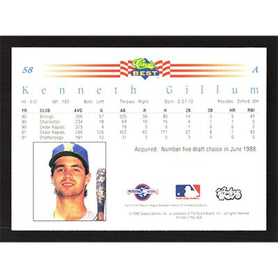 This is a 1992 Classic/Best Kenneth Gillum baseball card. The card is #58 and pictures show condition.