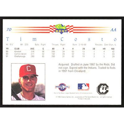 This is a 1992 Classic/Best Tim Costo baseball card. The card is #70 and pictures show condition.