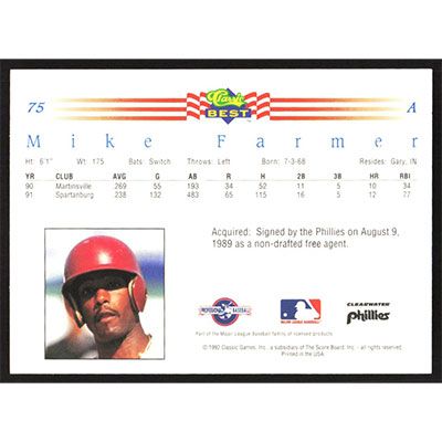 This is a 1992 Classic/Best Mike Farmer baseball card. The card is #75 and pictures show condition.