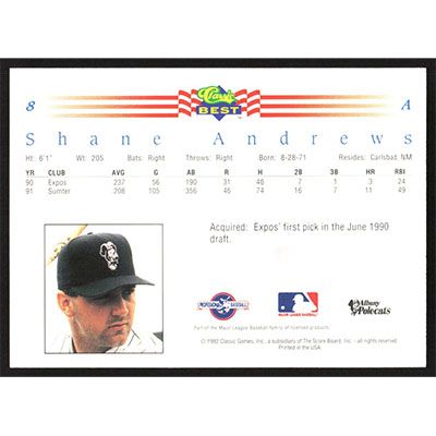 This is a 1992 Classic/Best Shane Andrews baseball card. The card is #8 and pictures show condition.
