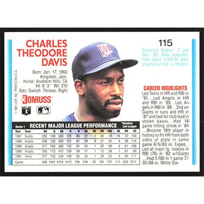 This is a 1992 Donruss Chili Davis baseball card. The card is #115 and pictures show condition.