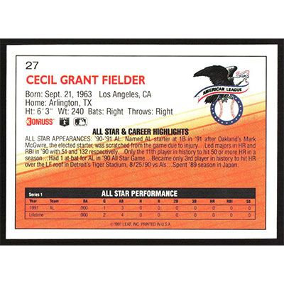 This is a 1992 Donruss Cecil Fielder All-Star baseball card. The card is #27 and pictures show condition.