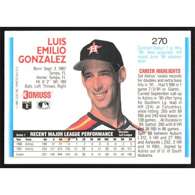 This is a 1992 Donruss Luis Gonzalez baseball card. The card is #270 and pictures show condition.