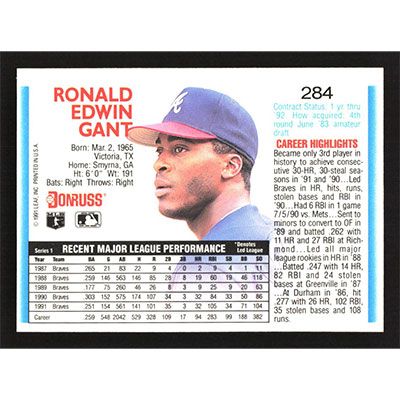 This is a 1992 Donruss Ron Gant baseball card. The card is #284 and pictures show condition.