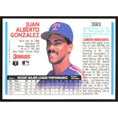 This is a 1992 Donruss Juan Gonzalez baseball card. The card is #393 and pictures show condition.