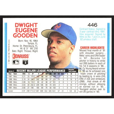 This is a 1992 Donruss Dwight Gooden baseball card. The card is #446 and pictures show condition.