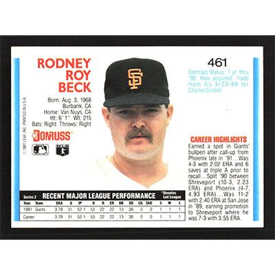 This is a 1992 Donruss Rod Beck baseball card. The card is #461 and pictures show condition.