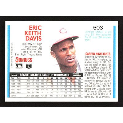 This is a 1992 Donruss Eric Davis baseball card. The card is #503 and pictures show condition.