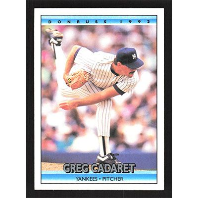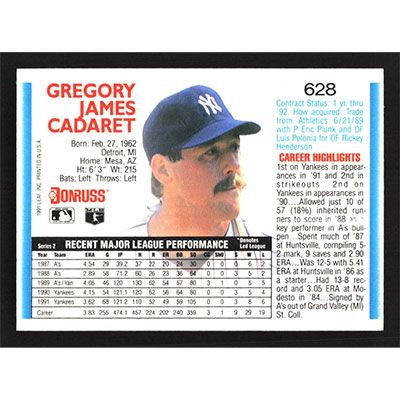 This is a 1992 Donruss Greg Cadaret baseball card. The card is #628 and pictures show condition.