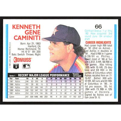 This is a 1992 Donruss Ken Caminiti baseball card. The card is #66 and pictures show condition.