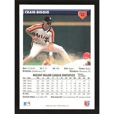 This is a 1992 Donruss Craig Biggio baseball card. The card is #84 and pictures show condition.