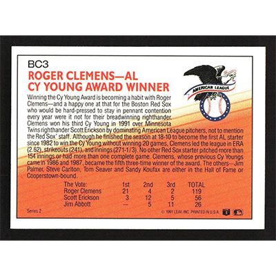 This is a 1992 Donruss Bonus Cards Roger Clemens Award Winner baseball card. The card is #BC3 and pictures show condition.
