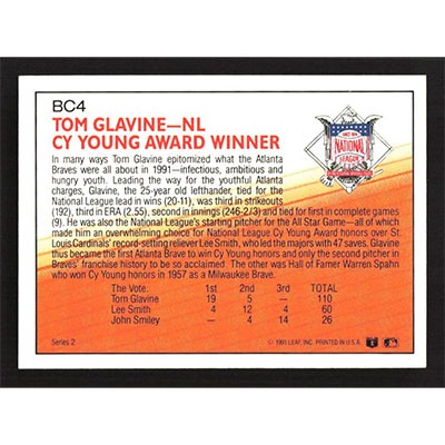 This is a 1992 Donruss Bonus Cards Tom Glavine Cy Young Award baseball card. The card is #BC4 and pictures show condition.