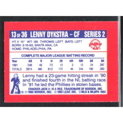 This is a 1992 Donruss Cracker Jack II Lenny Dykstra baseball card. The card is #13 and pictures show condition.