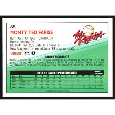 This is a 1992 Donruss The Rookies Monty Fariss baseball card. The card is #35 and pictures show condition.