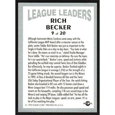 This is a 1992 Excel League Leaders Rich Becker baseball card. The card is #9 and pictures show condition.