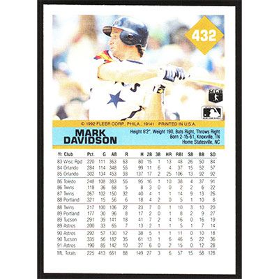 This is a 1992 Fleer Mark Davidson baseball card. The card is #432 and pictures show condition.