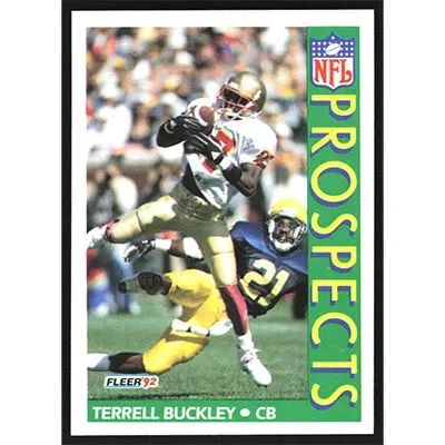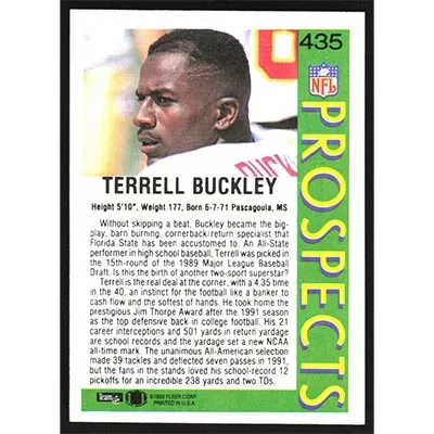 This is a 1992 Fleer Terrell Buckley Prospects football card. The card is #435 and pictures show condition. Team(s): Florida State Seminoles Rookie Card (RC)