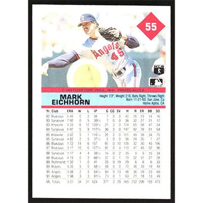 This is a 1992 Fleer Mark Eichhorn baseball card. The card is #55 and pictures show condition.