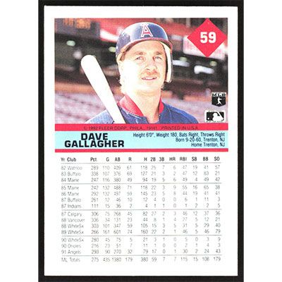 This is a 1992 Fleer Dave Gallagher baseball card. The card is #59 and pictures show condition.
