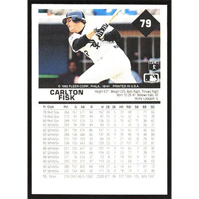 This is a 1992 Fleer Carlton Fisk baseball card. The card is #79 and pictures show condition.