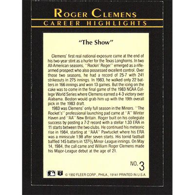 This is a 1992 Fleer Roger Clemens Career Highlights The Show baseball card. The card is #3 and pictures show condition.