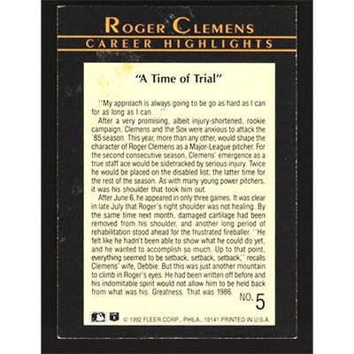This is a 1992 Fleer Roger Clemens Career Highlights A Time of Trial baseball card. The card is #7 and pictures show condition. Team(s): Boston Red Sox