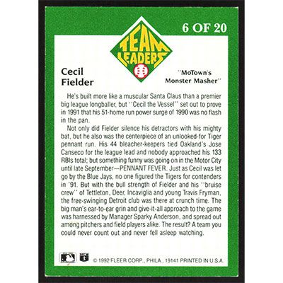 This is a 1992 Fleer Team Leaders Cecil Fielder baseball card. The card is #6 and pictures show condition.