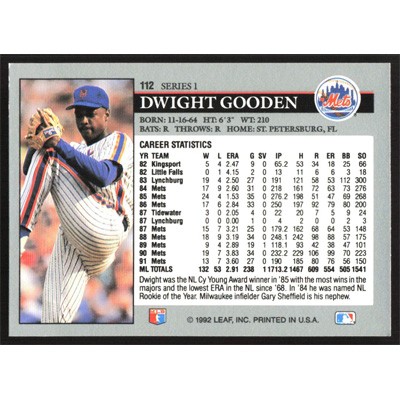 This is a 1992 Leaf Dwight Gooden baseball card. The card is #112 and pictures show condition.