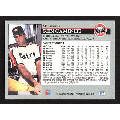 This is a 1992 Leaf Ken Caminiti baseball card. The card is #140 and pictures show condition.