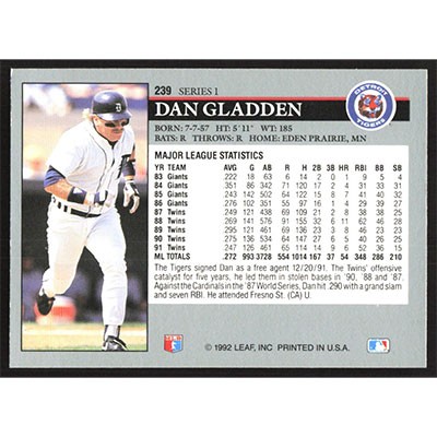 This is a 1992 Leaf Dan Gladden baseball card. The card is #239 and pictures show condition.