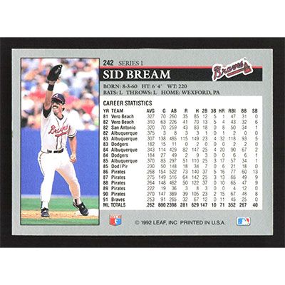 This is a 1992 Leaf Sid Bream baseball card. The card is #242 and pictures show condition.