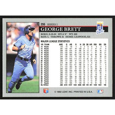 This is a 1992 Leaf George Brett baseball card. The card is #255 and pictures show condition.