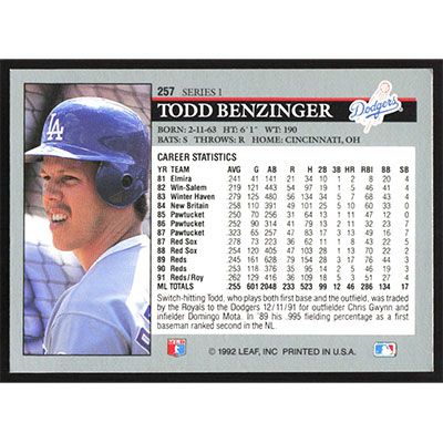 This is a 1992 Leaf Todd Benzinger baseball card. The card is #257 and pictures show condition.