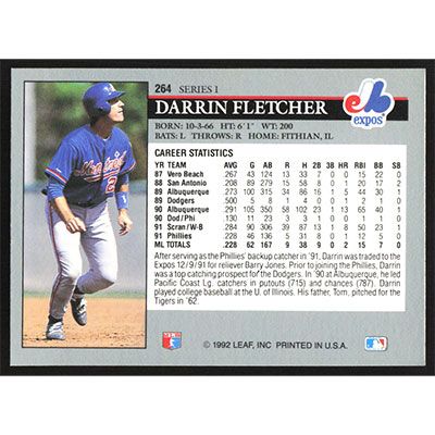 This is a 1992 Leaf Darrin Fletcher baseball card. The card is #264 and pictures show condition.