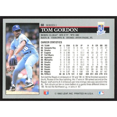This is a 1992 Leaf Tom Gordon baseball card. The card is #68 and pictures show condition.