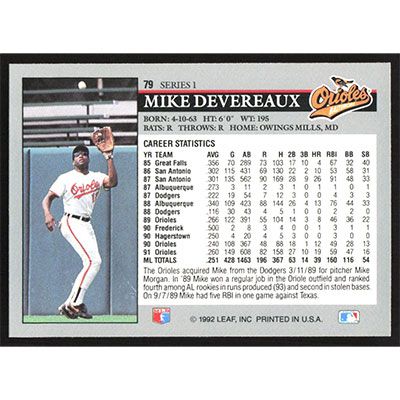 This is a 1992 Leaf Mike Devereaux baseball card. The card is #79 and pictures show condition.