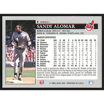This is a 1992 Leaf Sandy Alomar baseball card. The card is #9 and pictures show condition.