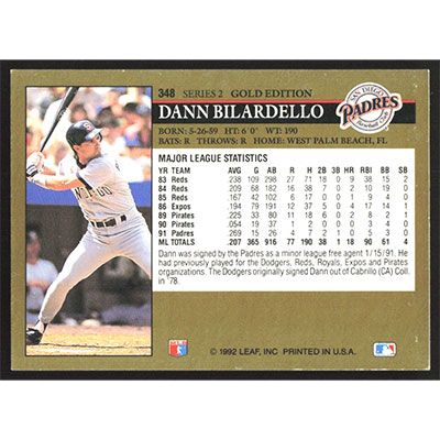This is a 1992 Leaf Black Gold Dann Bilardello baseball card. The card is #348 and pictures show condition.