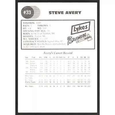 This is a 1992 Lykes Standard Steve Avery baseball card. This card has been signed, in blue, by Steve Avery, and is guaranteed authentic by Ballcardz.com. The card is #1 and pictures show condition.