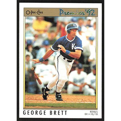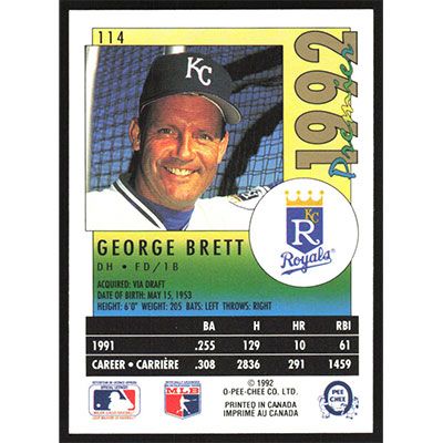 This is a 1992 O-Pee-Chee Premier George Brett baseball card. The card is #114 and pictures show condition.
