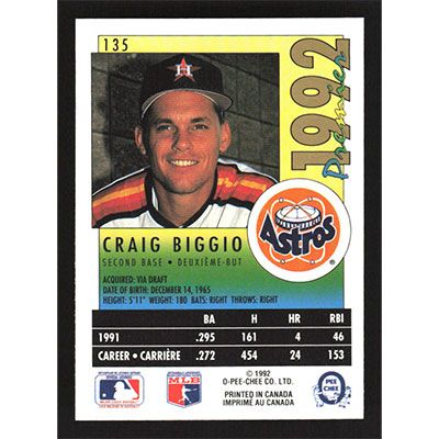 This is a 1992 O-Pee-Chee Premier Craig Biggio baseball card. The card is #135 and pictures show condition.