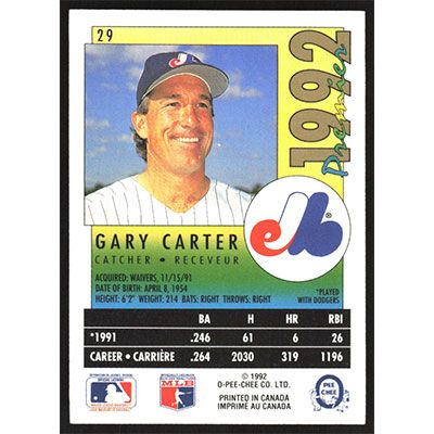 This is a 1992 O-Pee-Chee Premier Gary Carter baseball card. The card is #29 and pictures show condition.