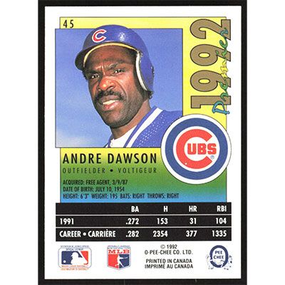 This is a 1992 O-Pee-Chee Premier Andre Dawson baseball card. The card is #45 and pictures show condition.
