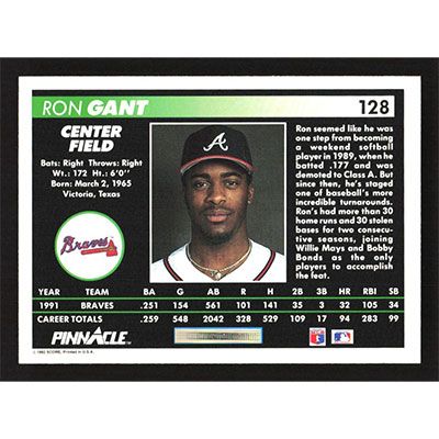 This is a 1992 Pinnacle Ron Gant baseball card. The card is #128 and pictures show condition.