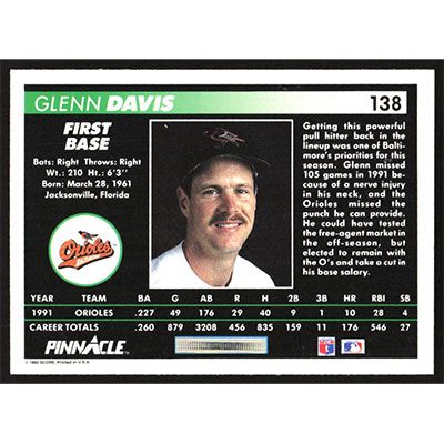 This is a 1992 Pinnacle Glenn Davis baseball card. The card is #138 and pictures show condition.