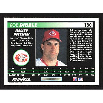 This is a 1992 Pinnacle Rob Dibble baseball card. The card is #180 and pictures show condition.